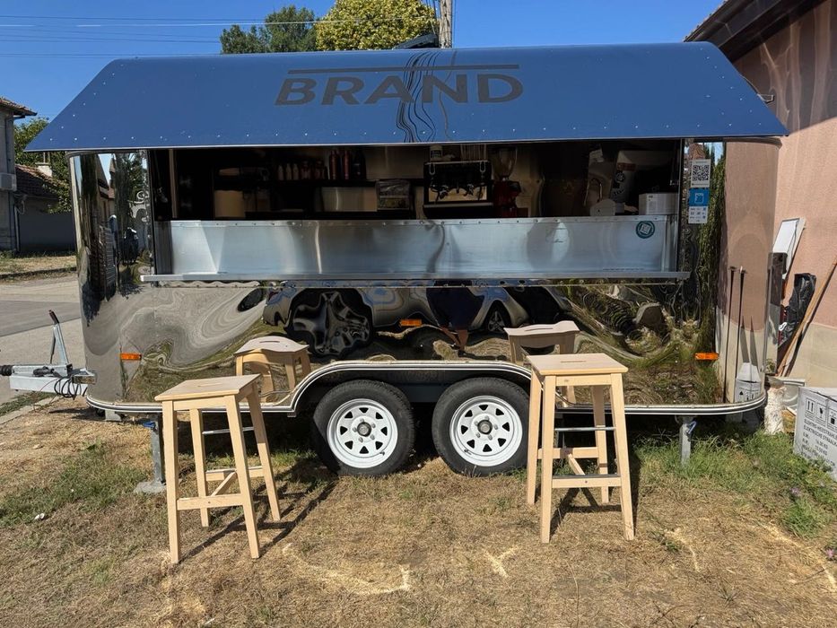 Мобилният кафе-бар е купуван и внесен 2024г директно от фабриката-производител в Китай и с оборудване по поръчка. Купето е от неръждаема стомана с висок клас товарни гуми, изолация, ел. система и система с няколко кръга – за водната помпа, led осветление, вентилатор на тавана, вграден хладилник с фризер, най-висок клас европейски теглич.
