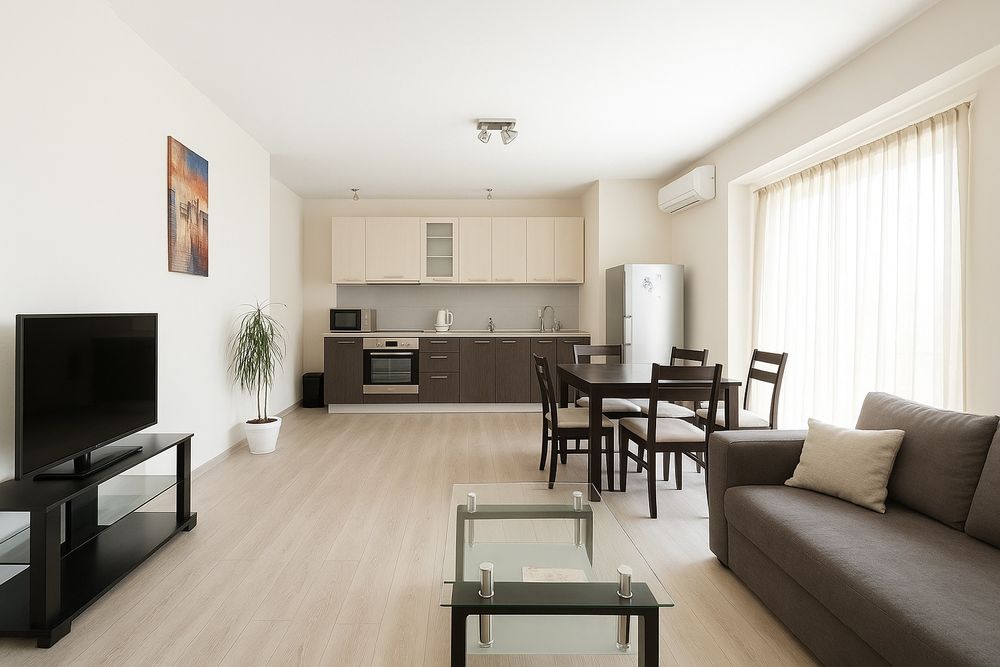Апартаментът се състои от входно антре, просторен и слънчев хол, съчетан с кухненски бокс и балкон, спалня с тераса и баня. Кухнята е напълно оборудвана с всички уреди, както и всички необходими домакински съдове и прибори.