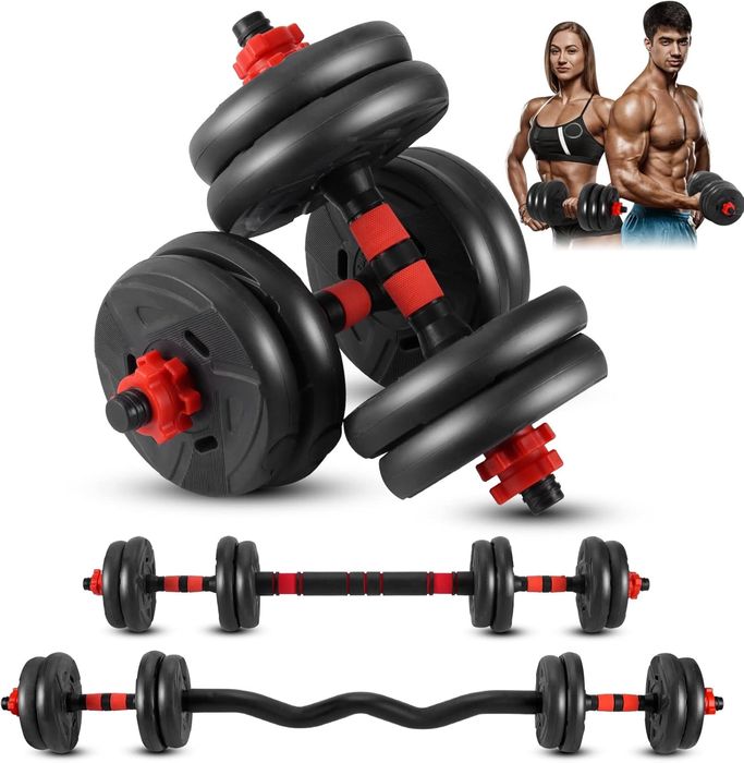 Двата дъмбела са разглобяеми и комплектът включва: Дискове с отвор Ф28: 4бр.х1,25кг, 4бр.х1,5кг, 4бр.х2,0кг; 4бр.х2,5кг. Ръкохватка 2бр. и 4 гайки. Допълнителен и лост-адаптор ( 2 броя крив и прав 41 см), с който може сглобите щанга.
