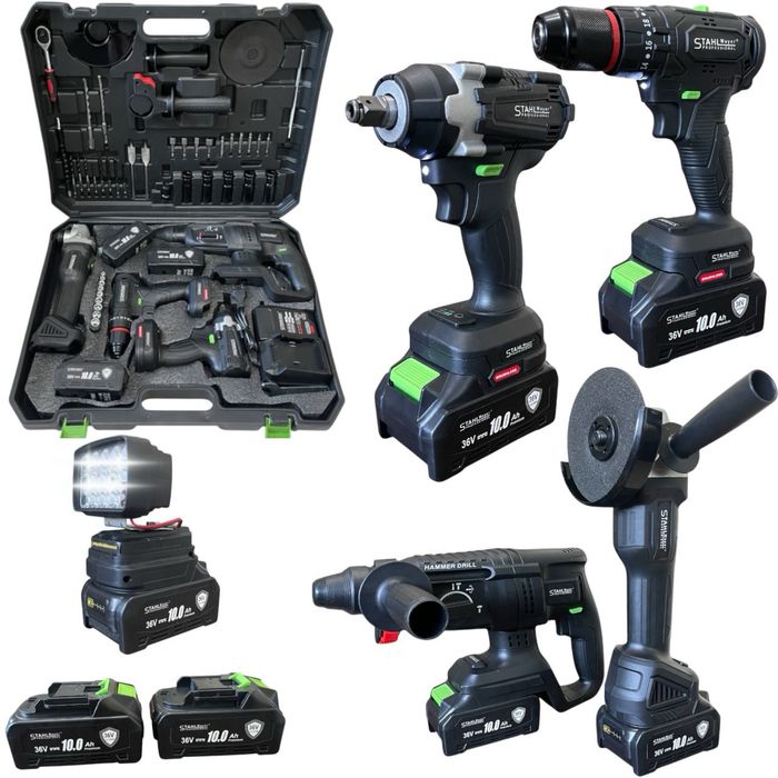 Акумулаторен комплект 5в1 , гайковерт , винтоверт , ъглошлайф , пефоратор , LED лампа – 36v 10.0A , STAHLMAYER