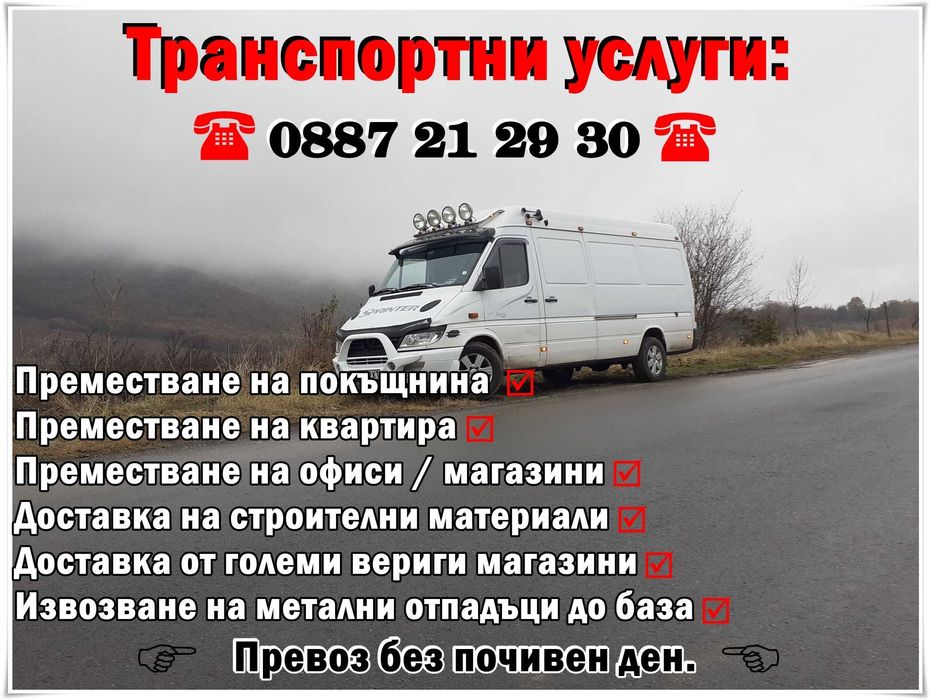 Извършвам превоз на всякакви товари до 2500 кг.(два тона и половина) като: мебели, багаж, лично имущество, офис обзавеждане, машини, търговско оборудване, стоки, апаратура, строителни материали и съоръжения, предмети на изкуството, палетни пратки, битова и професионална техника и много други.