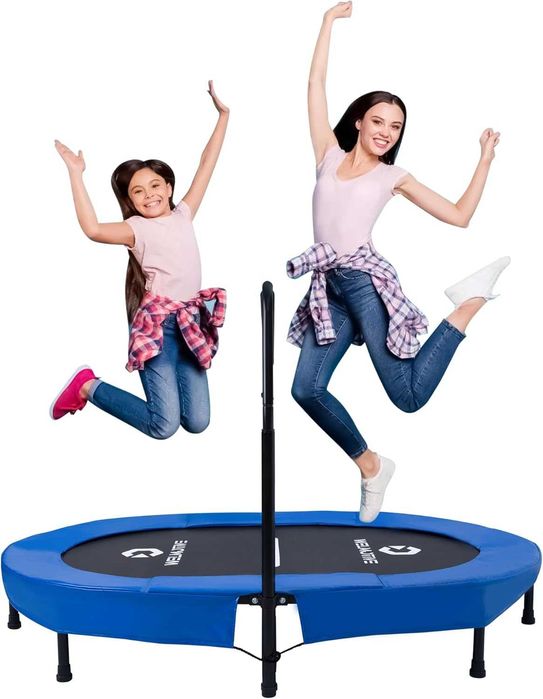 Този овален мини батут е със здрава стоманена рамка с 8 крака, меки ръбове, заоблени ъгли и подплатена регулируема дръжка за безопасно и стабилно подскачане. Просторната му повърхност с размери 92×142 см и 40-те издръжливи пружини осигуряват плавно и тихо подскачане, което е нежно за ставите, но е идеално за фитнес, забавление и тренировки за координация. Уникалната овална форма създава две отделни зони за скачане, позволявайки безопасно използване една до друга за семейно сплотяване. Сгъваем за лесно съхранение, подходящ е за всички възрасти, като е подходящ за начинаещи, деца и възрастни хора. Проектиран за дълготрайно удоволствие, той повишава пъргавината, издръжливостта и баланса, като същевременно е идеален за споделени домове или за подарък по всякакъв повод.
