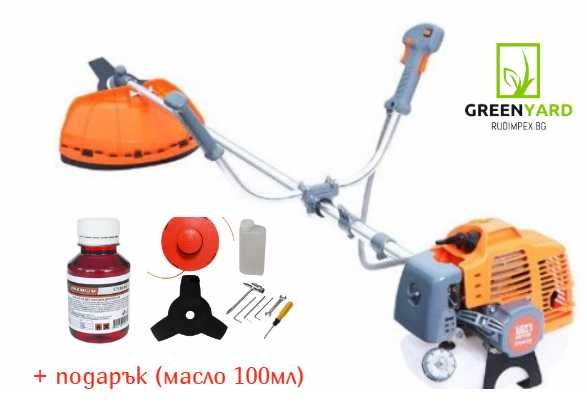 Моторна коса GREENYARD с екологичен и мощен двигател 2.5 к.с. Оборудвана с мултифункционална ръкохватка с темпомат за потдържане на постоянна газ и ергономично водене на уреда.За бързо,удобно и икономично косене на големи зелени площи и жилави и спластени бурени и храсти. Подходяща за честа употреба с голямо натоварване. Окомплектована с подходящ режещ инструмент, може да се използва и за рязане на дървовидни храсти и стебла с дебелина до 5-7см.диаметър.