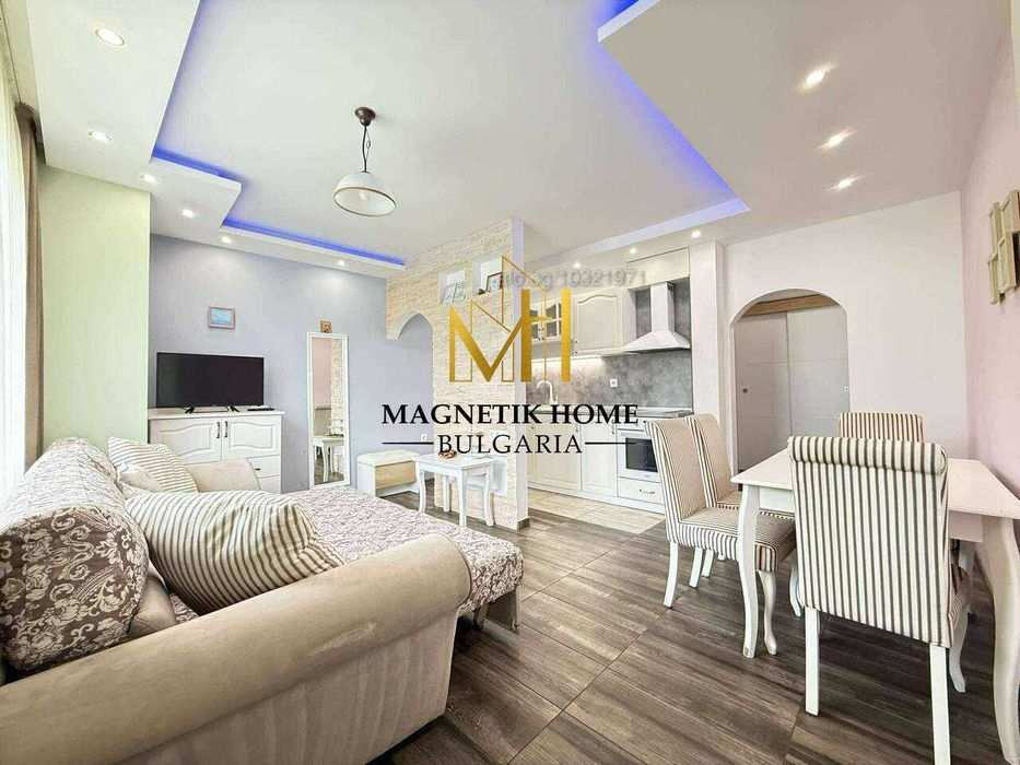 Апартаметът е оборудван изцяло до най – малкият детайл като в допълнение се предлагат чисто нов инвенторен климатик ”Gree”, високо – качествени електроуреди, цялостна кухненска посуда, спално бельо и т.н.