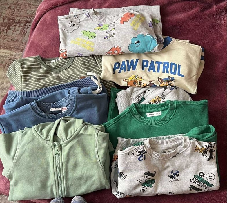 7 броя комплекти детски дрехи за момче – размер 98, дрехите са носени, нямат петна или скъсано, на едните панталонки има леки мъхчета събрани. Могат да бъдат още много носени, просто синът ми много бързо дръпна във височината и панталонките са ни къси. Има един комплект Зара, един Лупилу ( лидълската марка ), а останалите са Синсей.