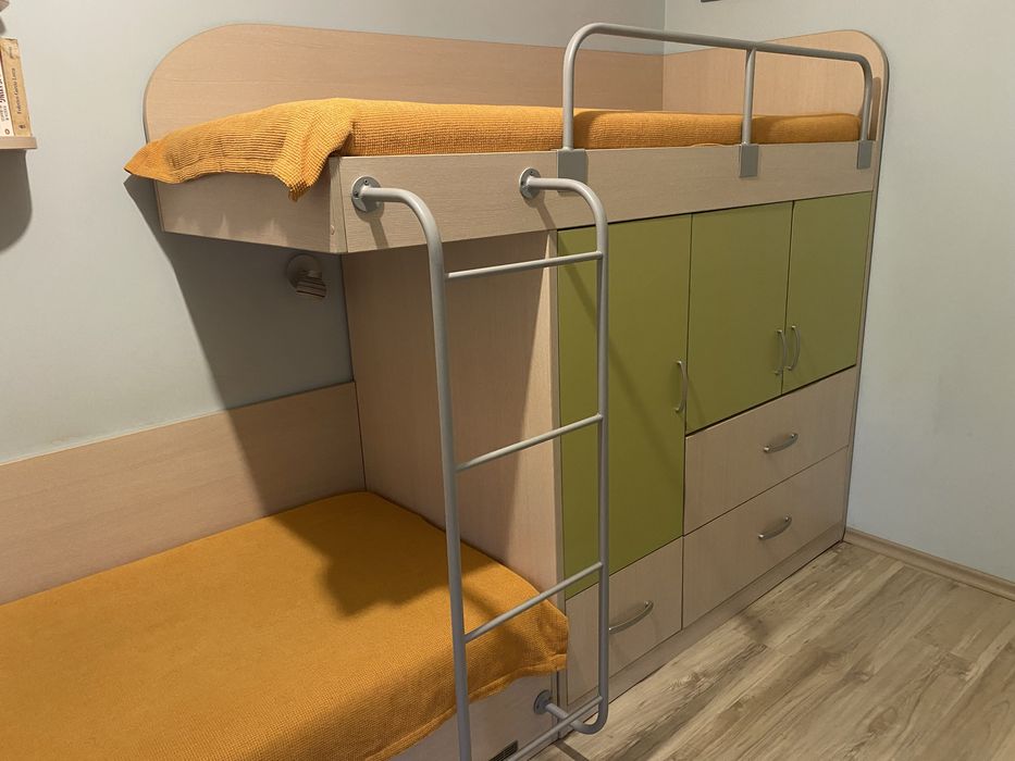 *Легла на два етажа с дълбоки шкафове/гардероби и две големи чекмеджета под горното легло. Модула е цял и много стабилен с приблизителна дължина 3.5 метра. Леглата не могат да се разделят. Металната стълба и преградата са много здрави и стабилни.