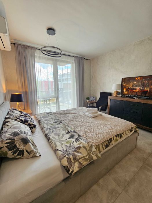 Модерен и уютен апартамент, който предлага всичко необходимо, било то за кратък или дълъг престой. Предоставяме Ви удобства като: напълно оборудвана кухня, двойно легло, смарт TV, бърз интернет, топли напитки и тоалетни принадлежности като комплимент за Вас. На метри от входа има хранителни магазини, салон за красота и барбър шоп, а в близост заведения за хранене и спирки на градски транспорт. Намира се в близост до едни от най-големите молове в града. Паркирането е свободно без зони.