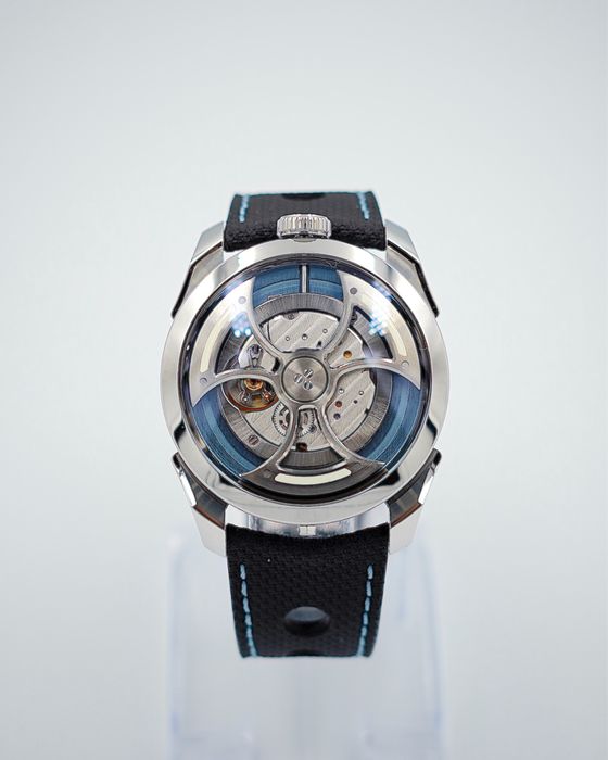 Каса от неръждаема стомана с полирани финиши в комбинация със сапфир кристал и минерално стъкло. Изключително нестандартен цифер, с навиващ се ротор от титан с три перки във форма на брадва и светещи лум вложки. Конкретният модел е тип “driver’s watch”, защото часът се гледа странично на корпуса, чрез въртящ се единичен пръстен от алуминий в цвят ледено синьо, покрит със Super-LumiNova. Идеята на модела е да гледаш часа, докато държиш ръката си на волана и шофираш. Предшественика на модела използва механизъм Miyota, вече новият модел разполага с швейцарски механизъм La Joux-Perret G101 с power reserve от 68 часа.