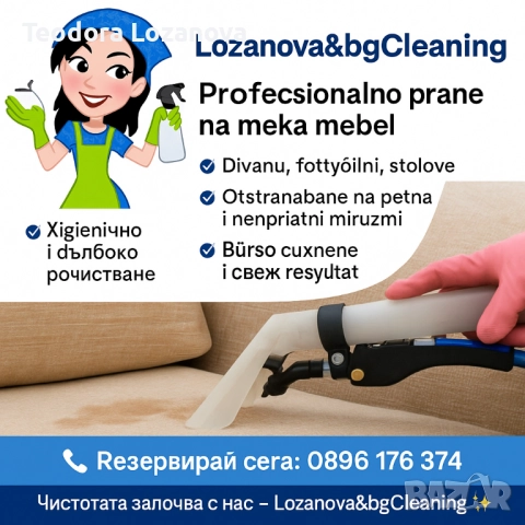 🛋️✨ Уморихте ли се да гледате петна и замърсявания по дивана? Ние връщаме живота на Вашата мека мебел! ✅ Професионално машинно пране в София ✅ Премахване на петна, прах и неприятни миризми ✅ Безопасни препарати – подходящи за деца и домашни любимци ✅ Бързо съхнене – мебели като нови още същия ден ✅ Работим и събота и неделя! 💲 Цени от: 🛋️ Диван до 3 места – 60 лв 🪑 Фотьойл – 20 лв 🛏️ Матрак – от 25 лв 🏠 Килими – от 3 лв/кв.м 📞 Телефон / Viber: 0896 176 374 ✨ LozanovaBG & Cleaning – свежест във всеки дом! ✨
