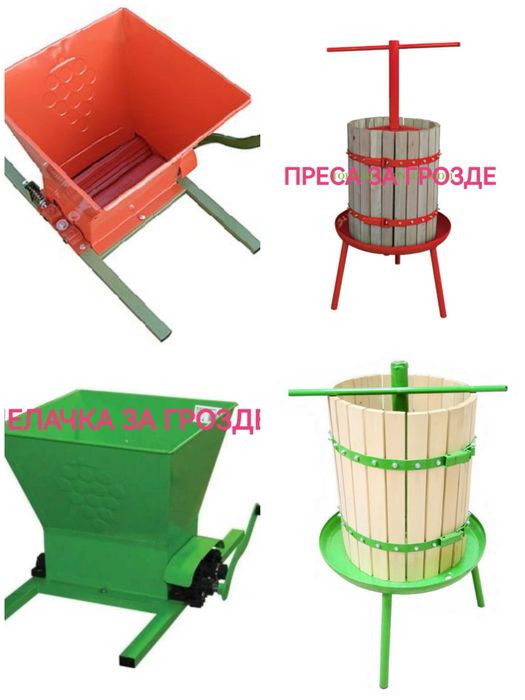 Качествени машини за мелене,мачкане и престане на грозде,изработени от здрави материали,съобразно изискванията и технологията за извършване на тази операция.Подходящи за битови нужди,както и за малки стопанства.