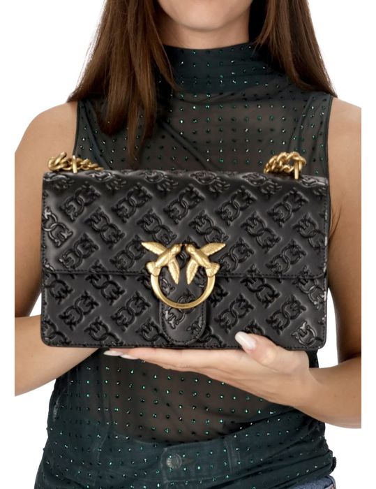 Иконичната Love Bag в класически размер – изработена от черна ембосирана кожа с изящен релефен мотив