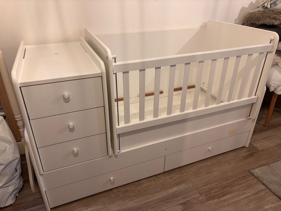 Детко легло, което се трансформира от бебешка кошара на легло за малки деца. Като ново, не е ползвано повече от 5 пъти.