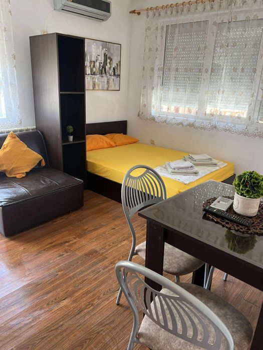 Студиото разполага с леглова база от 3 места – спаня и разтегателен диван. Оборудвано е с кухненски кът с необходимата посуда и пералня. Има две тераси.