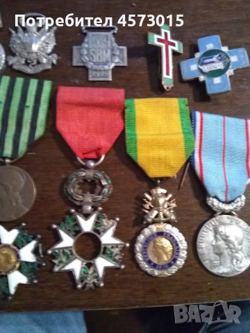 Изключително рядки ордени и медали от Франция сред които двойните оръдия на военния сребърен медал и миниятюра медал 1916 Вердун офицерски орден легион на честта с кутия от 18к масивно злато и още сребърни и позлатени и масонски малки знаци с позлата и емайл и една от масивно злато и разни сребърни и позлатени бижута и монети и медали плакети и военни и пожарникарски нагръдни знаци и значки и часовници подходящи за подаръци и инвестиции за избягване на инфлацията и за колекциониране и декорация
