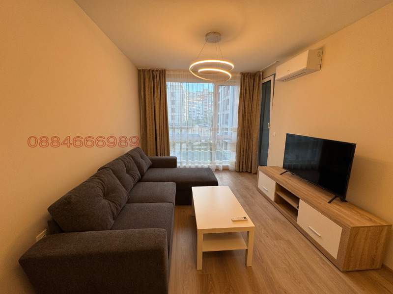 От собственик. Дава под наем нов, напълно обзаведен двустаен апартамент на 3ти жилищен етаж. Много просторен и топъл южен апартамент. Състои се от антре, спалня, дневна с кухня, баня с wc и балкон. Климатик във всяка стая. Изложението е юг. В кухнята има пералня Bosch, хладилник Liebherr, печка, котлон. В банята има бойлер и лира за отопление.