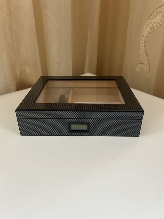 Висококачествен хумидор за съхранение на пури, изработен от испански кедър с елегантно карбоново покритие и прозрачен стъклен капак. Идеален както за лична употреба, така и за стилен подарък.