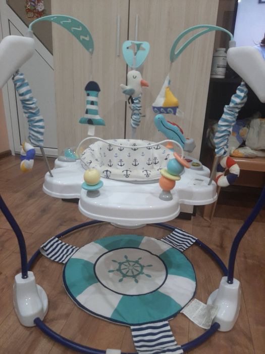 Детското бънджи е използвано много малко,седалката му се върти на 360 градуса, развива финната моторика за бебета над 6месеца