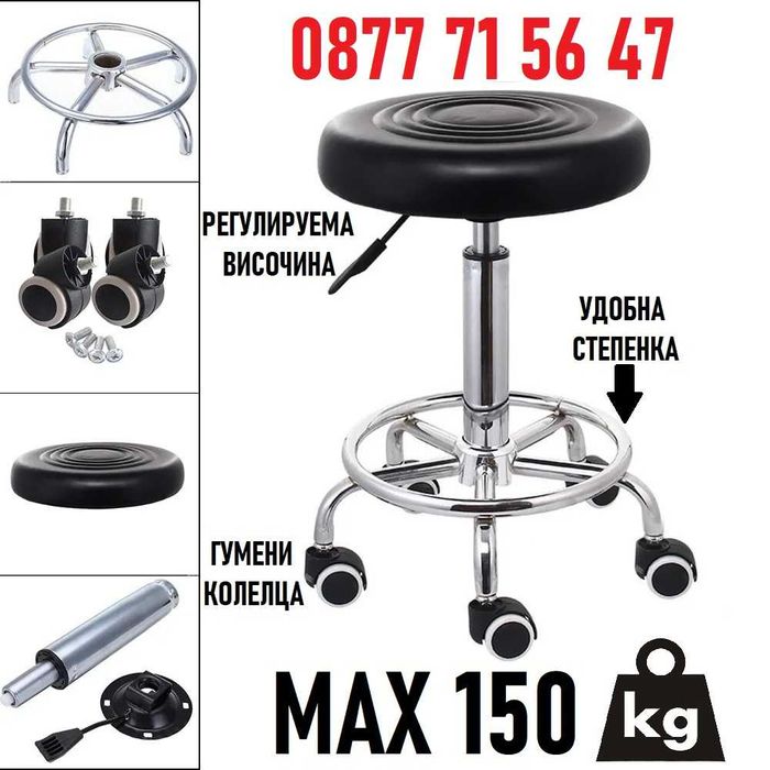 — Работна табуретка на колелца, козметичен, бръснарски, фризьорски стол до 150кг – ТОП ЦЕНА: 69.99лв. с вкл. ДДС