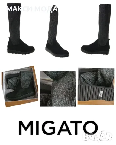 Дълги ботуши, тип чорапMIGATO, Гърция Нови, в оригиналната кутия Цвят черенВелур и текстил, еластичен, с блясъкНомер 40, UK 6,5, стелка 25,8 смВисочина на платформата 3,6 смЦена в сайта 79€75 лв.