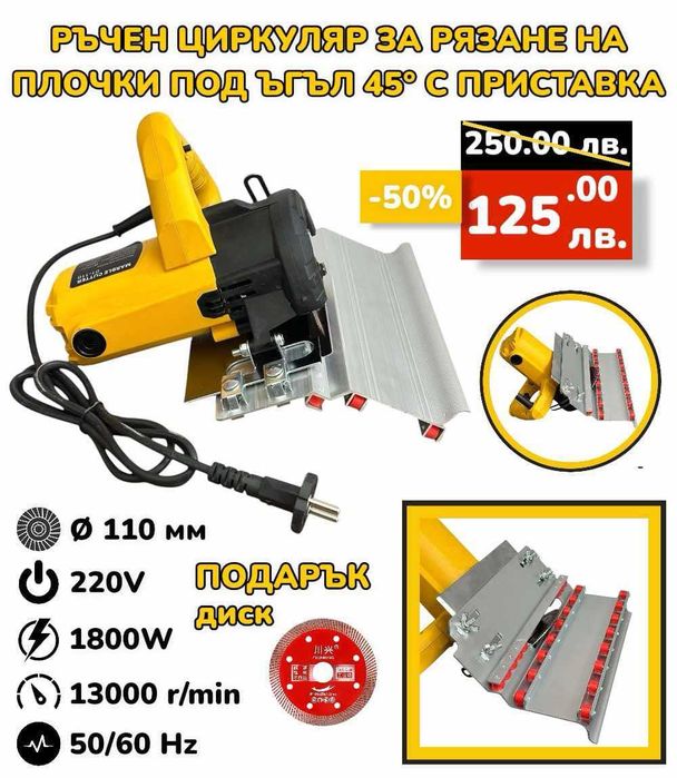 Машина за рязане на плочки, камък, дърво, под ъгъл 45 градуса+диск