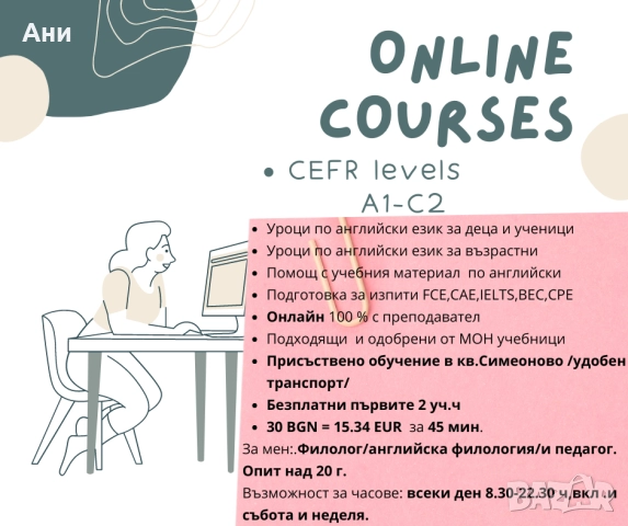 Безплатни обяви > Уроци по английски език за ученици и възрастни, присъствено и онлайн гр. София, Симеоново днес 30 лв 15,34 €