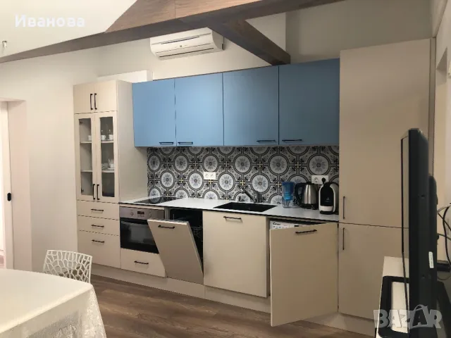 Кухня с посуда, вграден хладилник, миялна машина, пералня, котлони и фурна, климатик, интернет и телевизия.Капацитет на апартамента 2 възрастни с едно дете.За зимния сезон може да се наеме и краткосрочно за 1, 2 или 3 месеца.