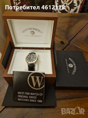 Продавам неизползван мъжки часовник на реномираната швейцарска марка Western end Watch със сертификат да произход. Марката е особено популярна сред монархиите на Арабския полуостров. У нас е рядкост. Със своя подчертан ретро стил, този автоматичен часовник на West End Watch Co. е великолепна реплика на модела, носен от Индийската армия по време на Първата световна война. Моделът Sowar 1916 разполага с позлатен корпус с извити лъгове, ултра-дебело сапфирено стъкло с конусовидна форма, както и черен винтидж циферблат с малка секундна скала и прозорец за дата. Всичко това е задвижвано от висококачествения механизъм ETA 2895-2, видим през прозрачния заден капак. Часовникът е с кожена каишка с ефект „крокодил“ и разгъваща се закопчалка. Опакован е в оригинална дървена кутия и е изключително подходящ за подарък за ценители.
