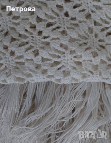 Красив и ефектен, голям, елегантен, ръчно плетен на една кука памучен шал-наметка, нов, бял, оригинален аксесоар, създаващ уникална визия. Шалът е във форма на триъгълник с основа 240 см. Двете страни са по 120 см. с дълги ресни накрая. Обгръща много добре раменете, може да се носи по много различни начини. Цена 50 лв. Изпраща се с 10% отстъпка от общоприетата куриерска такса.