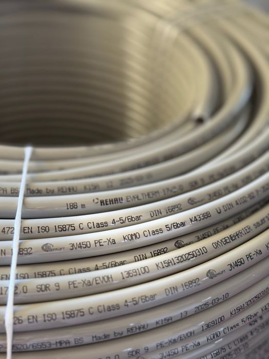 Продаваме висококачествена тръба за подово отопление от утвърдената марка REHAU – произведена в Германия. Подходяща за монтаж в къщи, апартаменти и сгради с подово отопление.