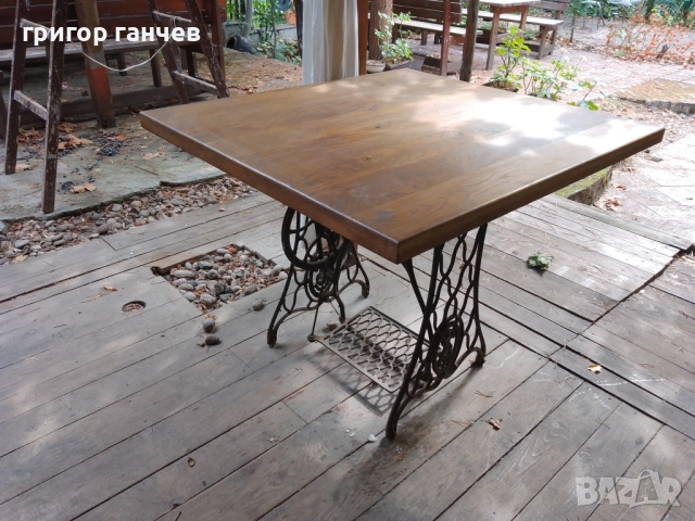 Маса с масивен плот от слепена дървесина – дъб и крака от шевна машина “Сингер”. Размер на плота /80/90/4 см. Общо четири маси. София, център