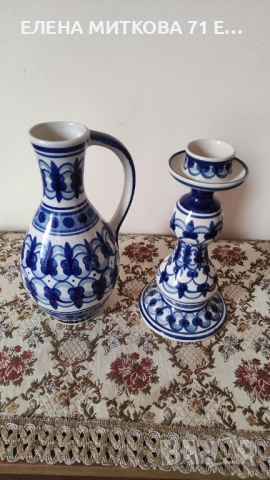 Керамичен лот в екрю и синьо – кана и свещник/без маркировка/.Според проучванията ми-производство ГДР