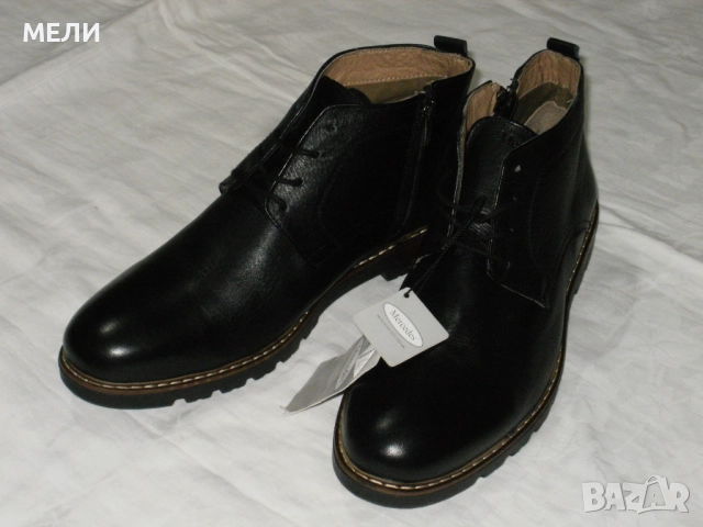 Обувките са на MERCEDES, оригинални нови с етикет. Изцяло от естествена кожа, вън и вътре. Цвета е черно, по номер са 42. Отгоре с връзки и отстрани с цип. Шити са за подметката. Произведени в Турция, класически модел и цвят, подходящи за всеки повод. Дължина на стелката 28см.