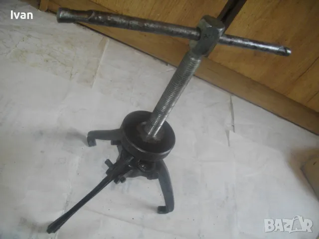 Голяма, масивна, трираменна скоба за вадене на лагери, старо Соц българско производство от годините на НРБ. Маркировка производител – ТПК Металик – гр.Разград. Скобата е от масивна плътна инструментална закалена стомана, от стария материал. Скобата е висок клас Соц производство. Маркировки ТПК Металик Р-Д ст40 – 150 – 20лв. Трираменна, масивна. Плътно дебело желязо на рамената. Захват за вадене на лагери 40-150 мм. Дължина от главата на рамената до до долу – 23 см. Дължина на винта изцяло – 28 см. Пружини на рамената за бърз захват. Захват отгоре на винта – квардарт М24 с прорези за върток. Оригиналният върток с дължина 29 см е наличен. Цялостна дължина на скобата с изцяло отворен винт 40 см. Разстояние между отделните челюсти рамена – 10 см. Захват на лагери до ф150мм. Скобата е почти нова, в добро работно състояние. Пружинния механизъм отваря и затваря съвсем леко, без никакво запъване. Винтовият механизъм има леко износване на резбата по средата на винта и на това място /около 2 см/върви тежко, по останалата дължина на винта резбата върви съвсем леко и бързо. Масивен метален стопер кръгъл над рамената. Тегло на скобата – 3,0 кг. Цена 299 лв.