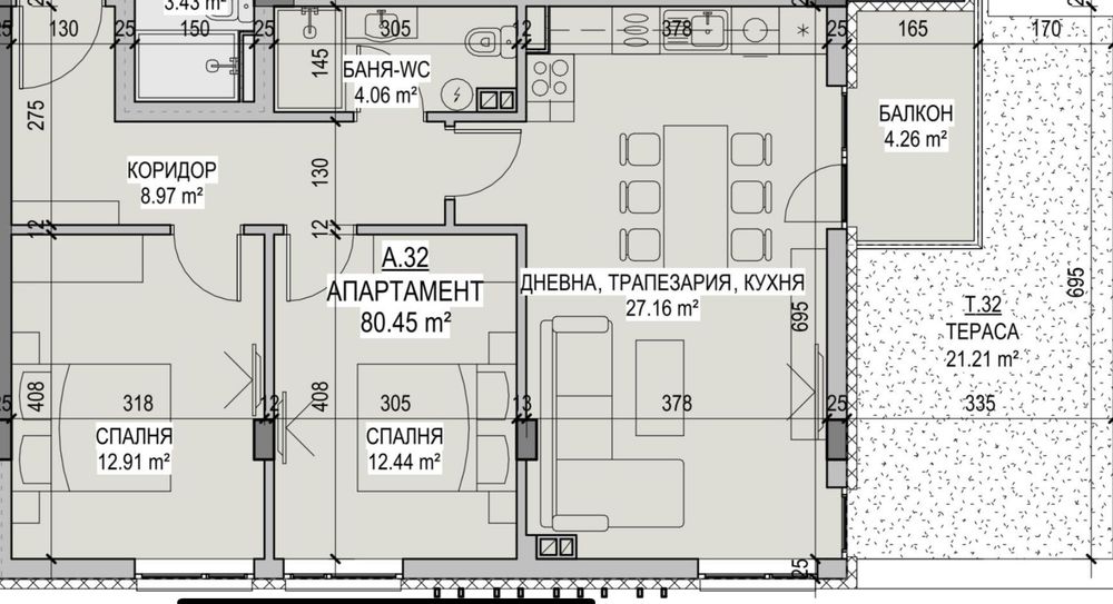 – Стаи: 3 (2 спални + дневна с кухненски бокс)